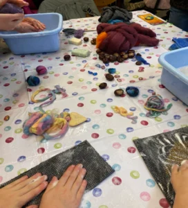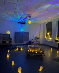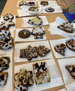 Im oberen Stockwerk des Altbaus herrschte fröhliches Gewusel: In mehreren Räumen wurden kreative Aktionen für Kinder angeboten – mit Begeisterung betreut von Eltern und Schüler:innen. So entstanden im „Feengarten“ wahre Kunstwerke aus Naturmaterialien, es wurden Traumfänger geknüpft, Steine bemalt, duftendes Haaröl und Badesalz bei der Station „Naturkosmetik“ hergestellt, Armbänder und Kastanien gefilzt und Waldorflichter gefaltet. Leckere Lebkuchen wurden kunstvoll verziert, und ein besonders stimmungsvoller, magischer Ruheraum war für die Aktion „Schiffchen schwimmen“ geschaffen – abgedunkelt und begleitet von sanfter Naturmusik.